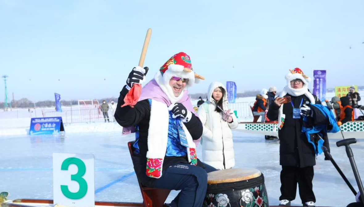 Cheers pierced the frigid air over the frozen Songhua River in northeast China's Heilongjiang Province on Saturday, as students from elite Chinese and British universities competed in a first-of-its-kind ice dragon boat race.