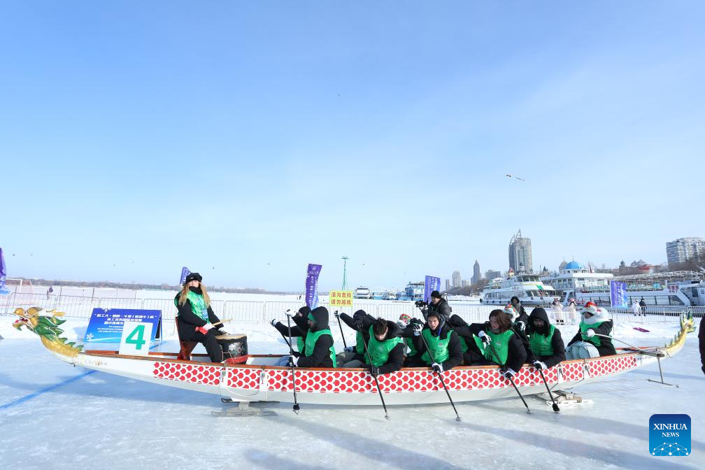 Students from Cambridge compete during the "HIT-Cambridge-Oxford Cup" Ice Dragon Boat International Friendship Race in Harbin, northeast China's Heilongjiang Province, Jan. 10, 2026. (Xinhua)