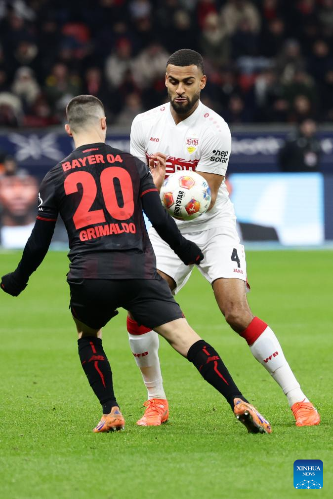 Alejandro Grimaldo (L) of Bayer 04 Leverkusen vies with Josha Vagnoman of VfB Stuttgart during the German first division of Bundesliga football match between Bayer 04 Leverkusen and VfB Stuttgart in Leverkusen, Germany, Jan. 10, 2026. (Photo by Joachim Bywaletz/Xinhua)