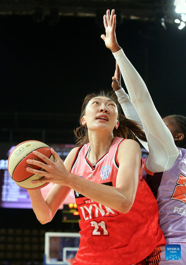 Han Xu (L) of Perth Lynx competes during the Women's National Basketball League (WNBL) basketball match between Perth Lynx and Adelaide Lightning in Perth, Australia on Jan. 10, 2026. (Photo by Zhou Dan/Xinhua)