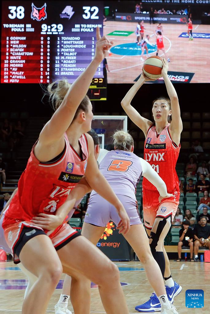Han Xu (rear) of Perth Lynx passes the ball during the Women's National Basketball League (WNBL) basketball match between Perth Lynx and Adelaide Lightning in Perth, Australia on Jan. 10, 2026. (Photo by Zhou Dan/Xinhua)