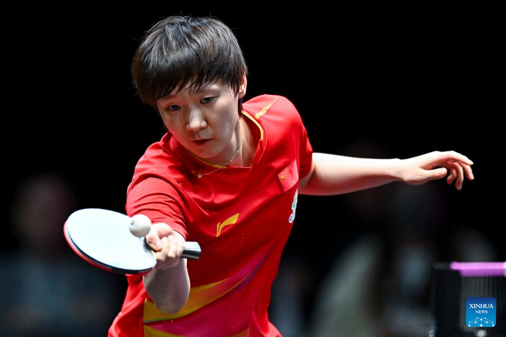 Wang Manyu of China hits a return during the women's singles quarter-final match against Han Ying of Germany at the WTT Champions Doha 2026 in Doha, Qatar, on Jan. 10, 2026. (Photo by Nikku/Xinhua)