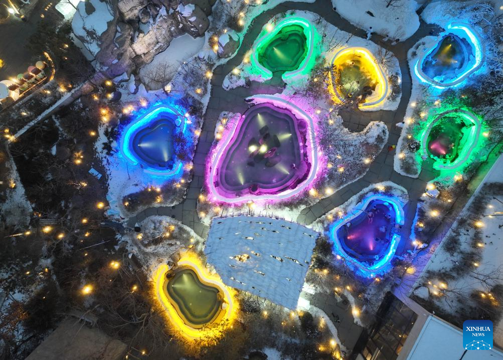 An aerial drone photo shows visitors enjoying a hot spring surrounded by ice and snow at a hot spring resort in Shenyang, northeast China's Liaoning Province, Jan. 9, 2026. Leveraging its unique natural resources, Shenyang offers special winter tourism experiences by combining ice-and-snow activities with hot springs, attracting visitors from across the country. (Xinhua/Li Gang)