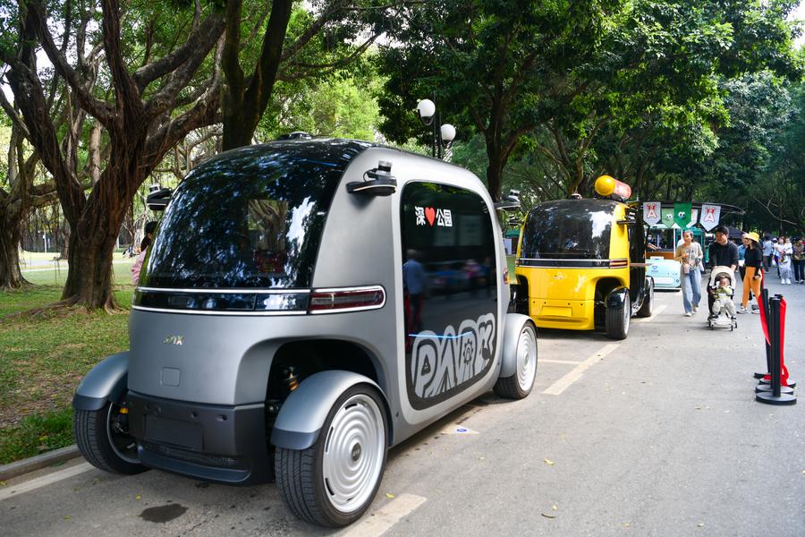 This photo taken on Nov. 11, 2024 shows smart unmanned vehicles at Lianhuashan Park in Shenzhen, south China's Guangdong Province. [Photo/Xinhua]