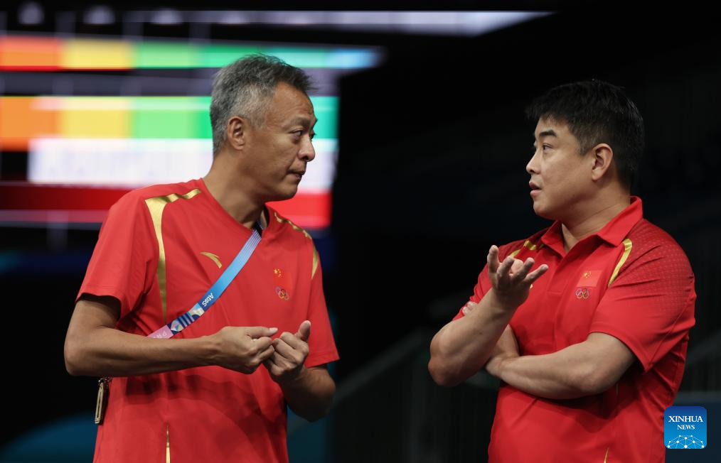 Wang Hao (R) and Qin Zhijian, coaches of the Chinese national table tennis team, talk with each other during a table tennis training session ahead of the Paris 2024 Olympic Games in Paris, France, on July 24, 2024. (Xinhua/Wang Dongzhen)