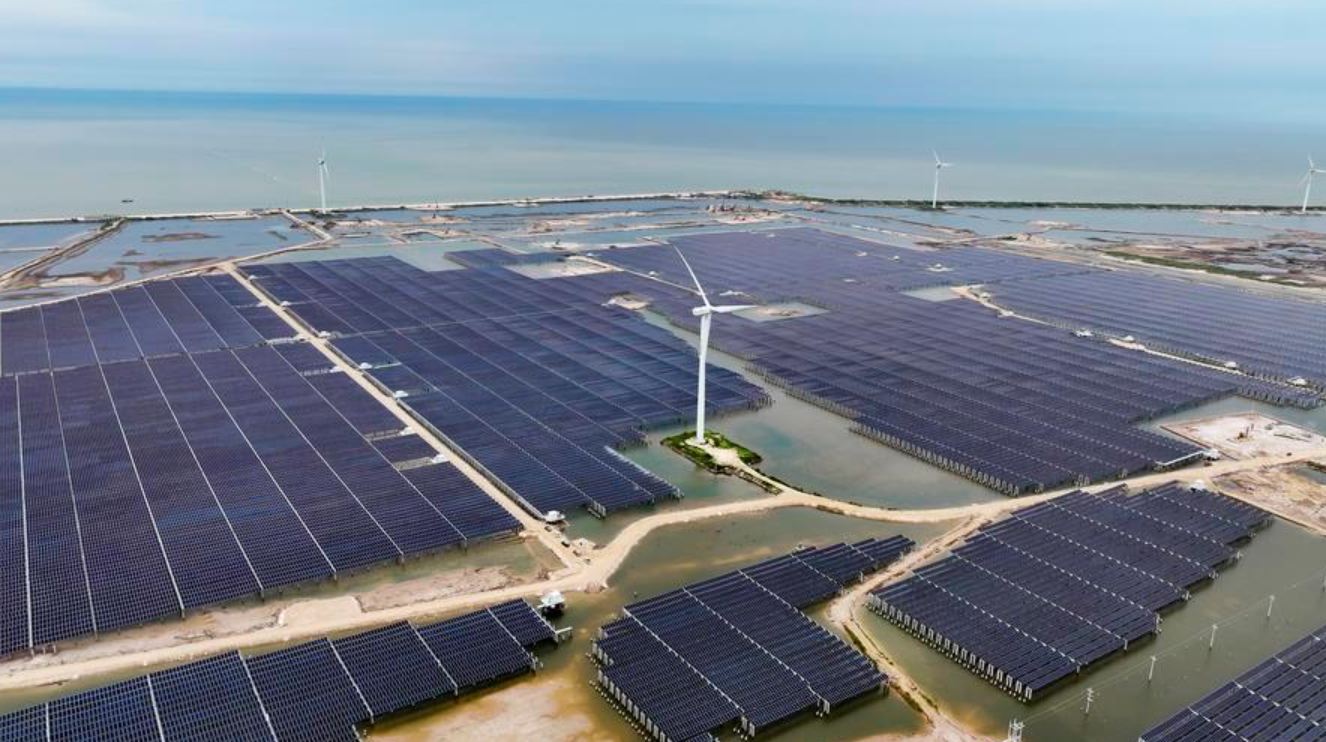 An aerial drone photo taken on Aug. 8, 2025 shows a demonstration project for integrated photovoltaic and energy storage in Dongying City, east China's Shandong Province. Dongying City has been actively developing clean energy in recent years. (Xinhua/Guo Xulei)