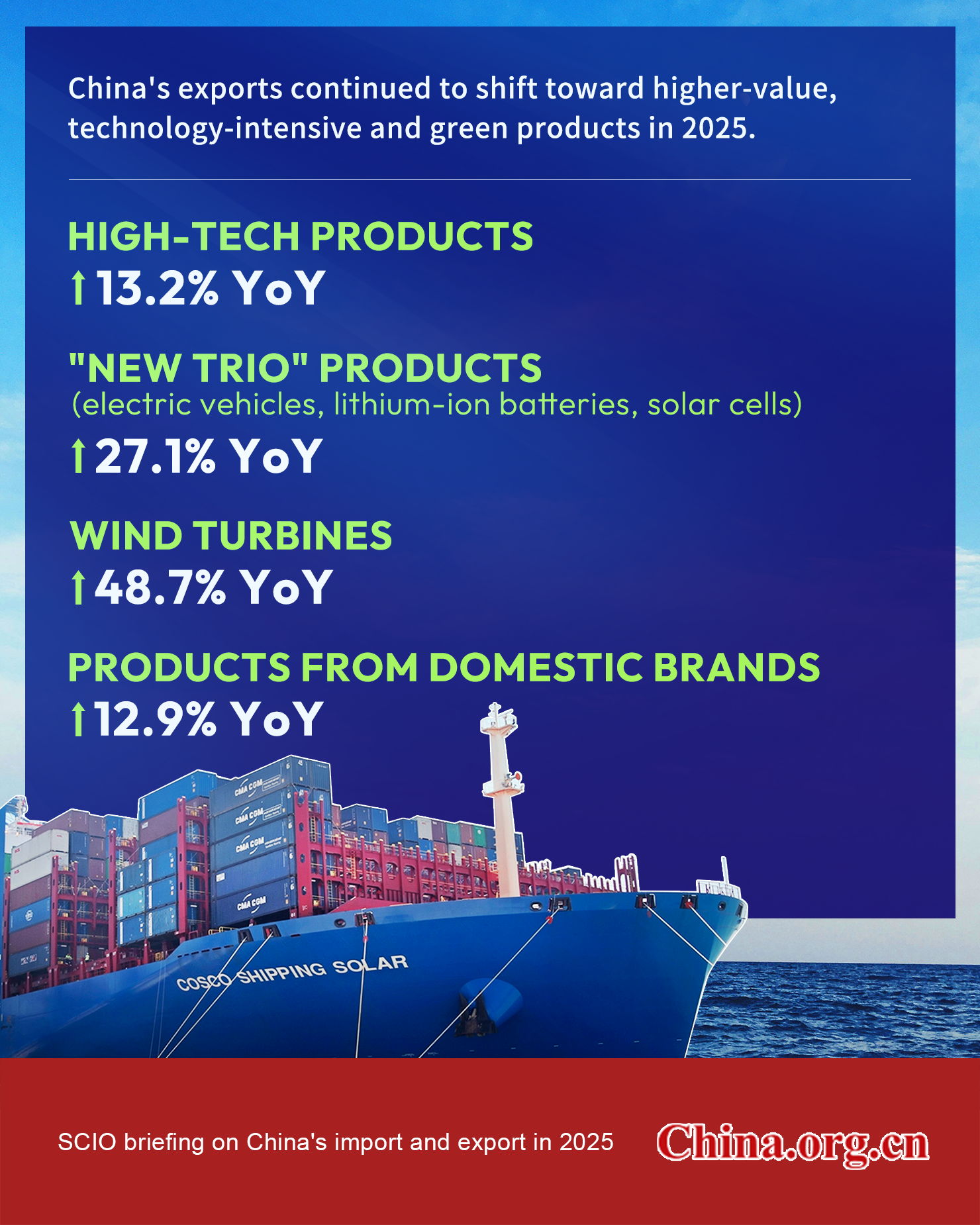 China's exports continued to shift toward higher-value, technology-intensive and green products, with exports of high-tech products reaching 5.25 trillion yuan (US$752.6 billion) in 2025, up 13.2% year on year, according to a press conference on Wednesday. Shipments of "new trio" products and wind turbines surged by 27.1% and 48.7%, respectively, while exports of domestic brands rose by 12.9%.