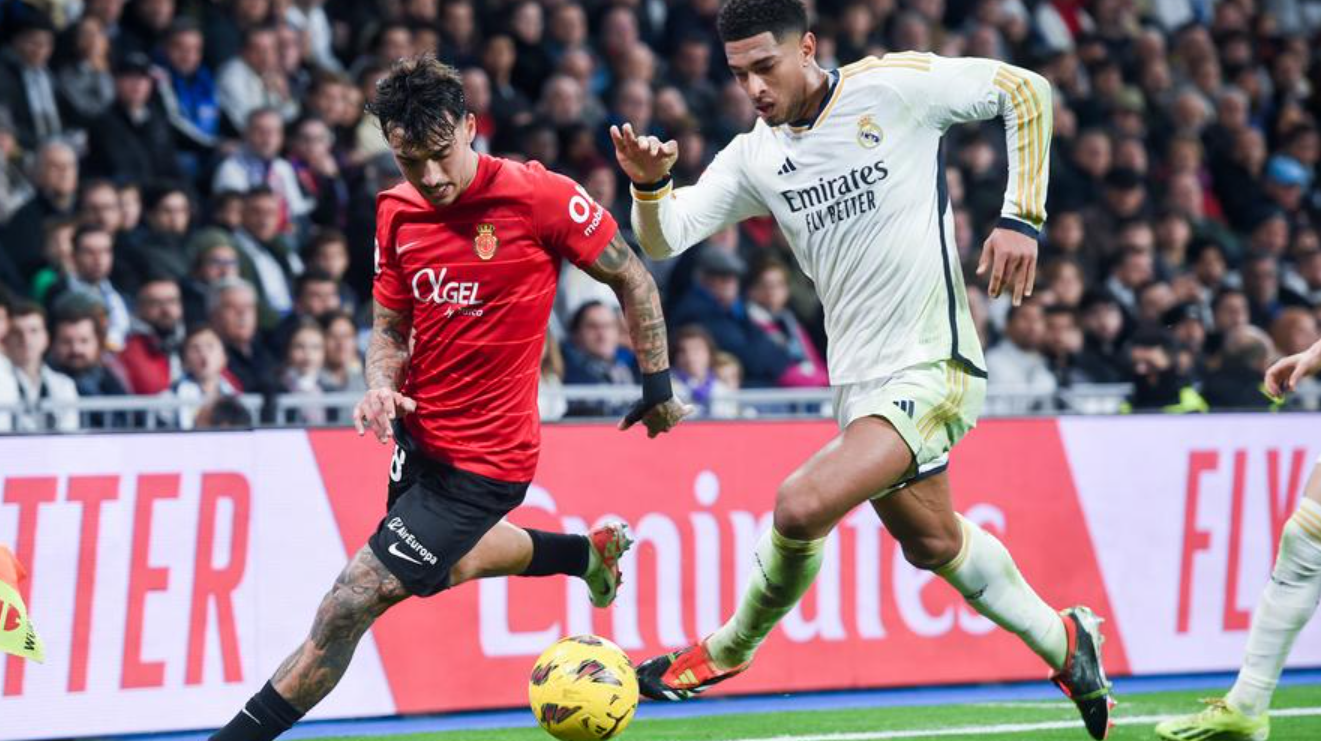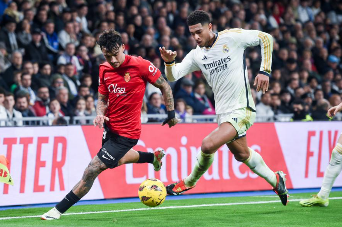 Jude Bellingham (R) of Real Madrid vies with Antonio Sanchez of Mallorca during their La Liga match in Madrid, Spain, Jan. 3, 2024. (Photo by Gustavo Valiente/Xinhua)