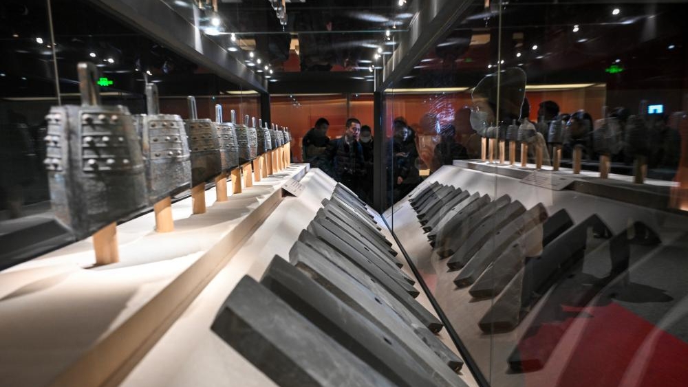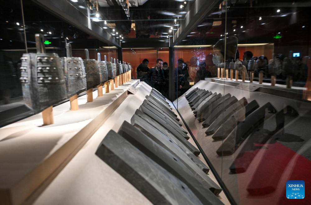 This photo taken on Dec. 26, 2025 shows bronze chimes at the exhibition "Echoes of King Kaolie -- Archaeological Discoveries from the Wuwangdun Tomb No. 1" in the National Museum of China in Beijing, capital of China. [Photo/Xinhua]