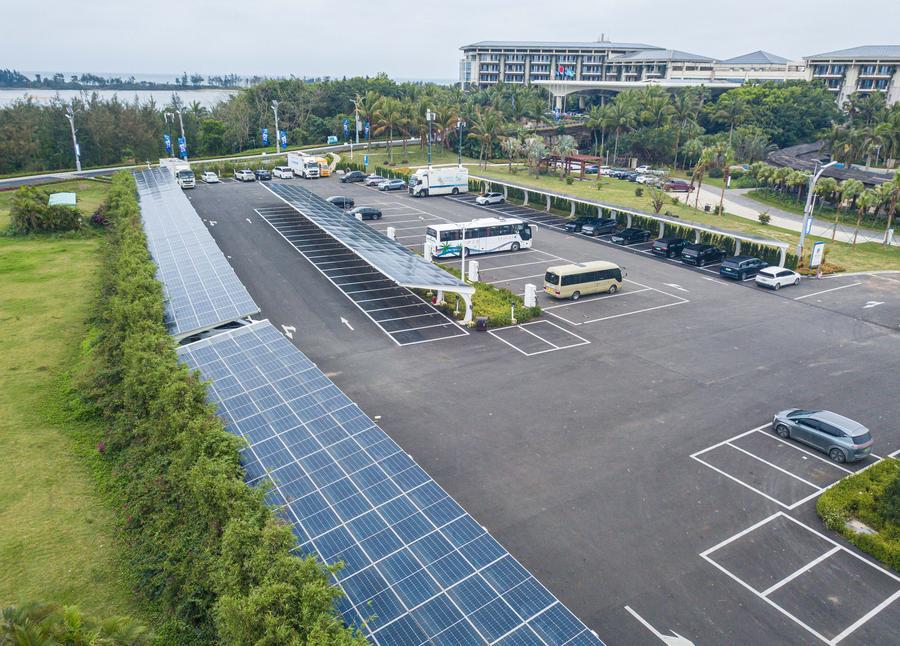 An aerial drone photo taken on March 16, 2025 shows the photovoltaic devices at a parking lot in the Boao zero-carbon demonstration zone in Boao, south China's Hainan Province. [Photo/Xinhua]