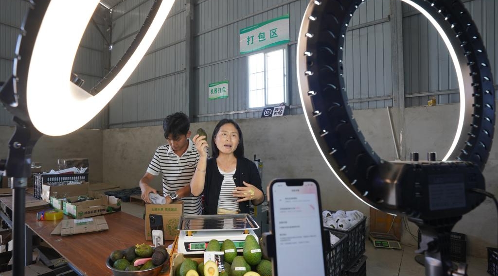 A woman sells avocados via live-streaming at a company in Menglian County, Pu'er City, southwest China's Yunnan Province, Nov. 16, 2025. [Photo/Xinhua]