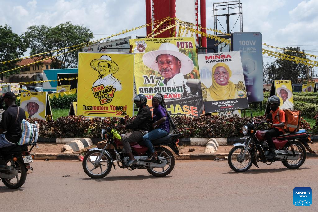 This photo taken on Jan. 13, 2026 shows campaign posters ahead of Uganda's general elections in Kampala, Uganda. [Photo/Xinhua]