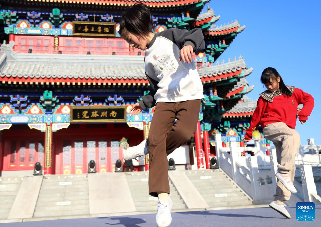 This photo taken on Dec. 21, 2025 shows children playing shuttlecock during a competition on an ancient street on Winter Solstice in Cangzhou City, north China's Hebei province.