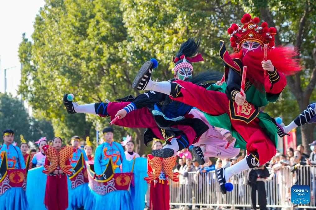 This photo taken on Dec. 20, 2025 shows folk artists performing Yingge Dance during a cultural parade in Xiepu Town, Ningbo City of east China's Zhejiang province.