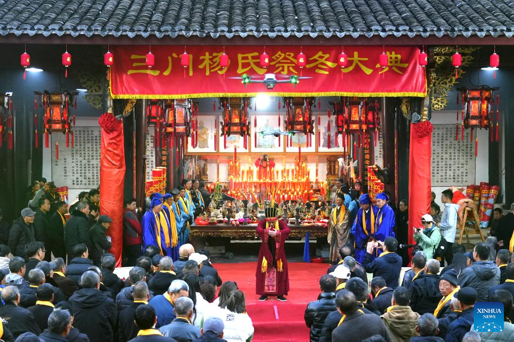 This photo taken on Dec. 21, 2025 shows a tradtional winter worship ceremy held on Winter Solstice in Yangjia Village, Taizhou City of east China's Zhejiang province.