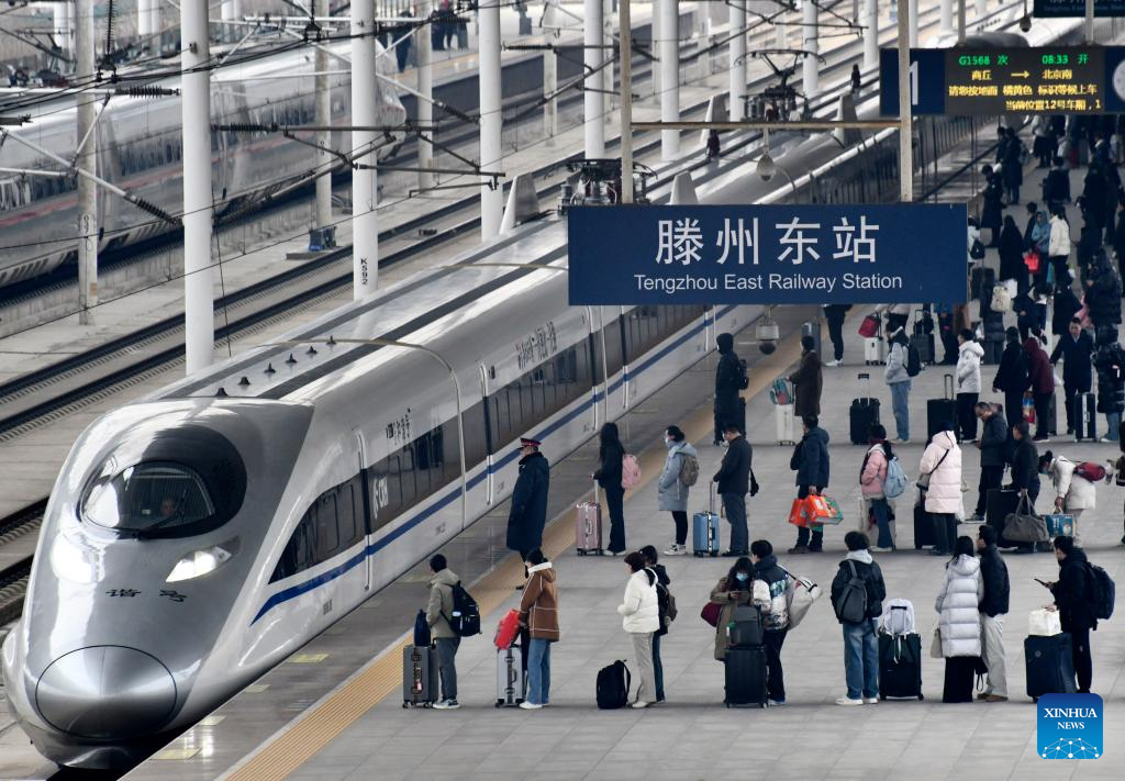 Passengers wait to board a train at Tengzhou East Railway Station in Zaozhuang City, east China's Shandong province, Feb. 22, 2025. [Photo/Xinhua]