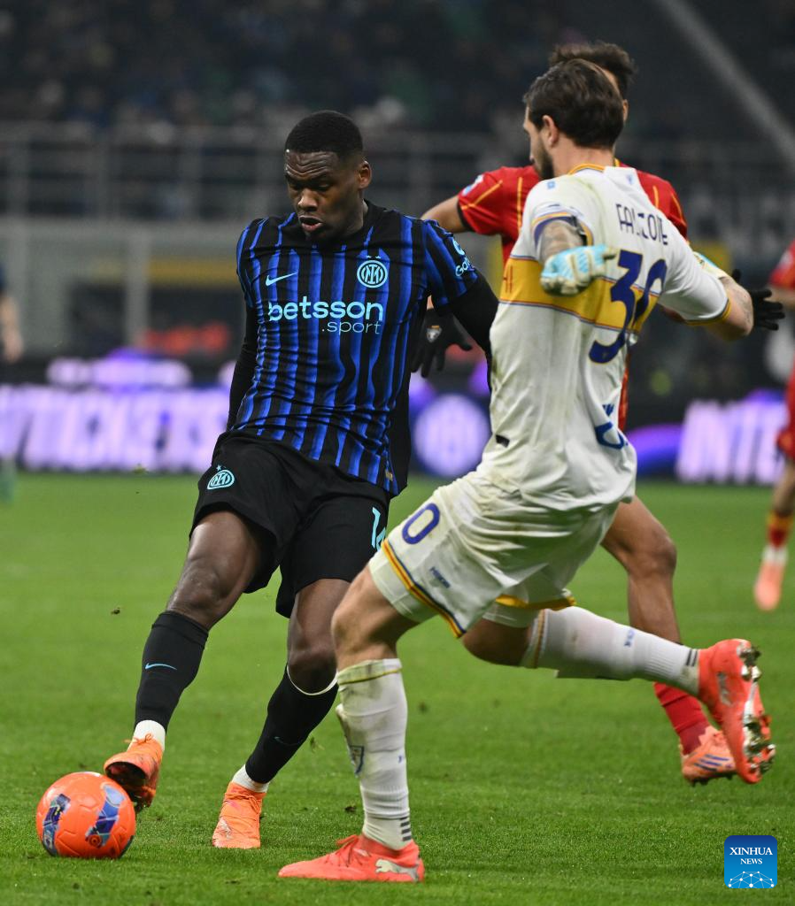 Inter Milan's Ange-Yoan Bonny (L) vies with Lecce's goalkeeper Wladimiro Falcone (front) during a Serie A football match between Inter Milan and Lecce in Milan, Italy, Jan. 14, 2026. (Photo by Alberto Lingria/Xinhua)