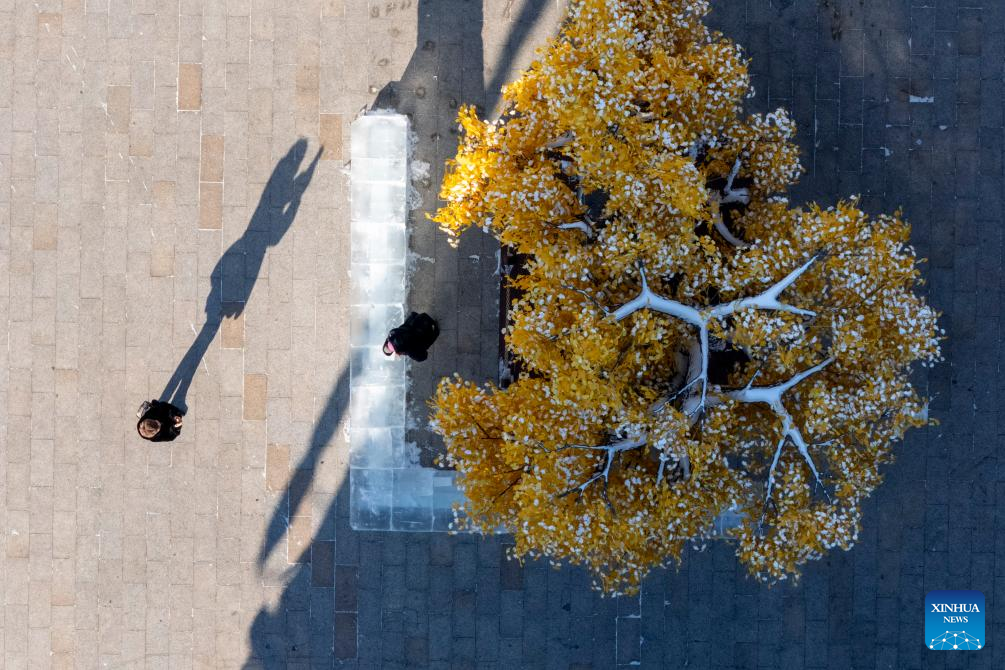 An aerial drone photo taken on Jan. 14, 2026 shows a tourist posing for photos at the Chinese Baroque Historic and Cultural Block in Harbin, northeast China's Heilongjiang Province. Harbin is a major winter tourism destination in northeast China. The city's Chinese Baroque Historic and Cultural Block is attracting an increasing number of visitors. The century-old architectural complex, a fusion of Chinese and Western styles, displays a unique charm as the ice and snow season peaks. (Xinhua/Zhang Tao)