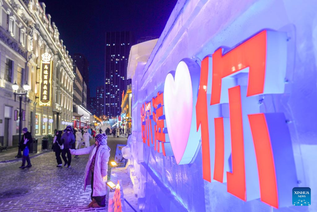 1月13日,游客在中华巴洛克历史文化街区一处冰景前留影。随着“冰城”哈尔滨进入冰雪旅游旺季,中华巴洛克历史文化街区吸引越来越多的游客。在冰雪元素的映衬下,中西合璧的百年建筑群更添风韵,奏响了一曲建筑与冰雪交融的冬日乐章。[新华社记者 王建威 摄]