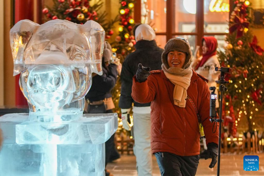 1月13日,游客在中华巴洛克历史文化街区兽首冰雕旁拍照。随着“冰城”哈尔滨进入冰雪旅游旺季,中华巴洛克历史文化街区吸引越来越多的游客。在冰雪元素的映衬下,中西合璧的百年建筑群更添风韵,奏响了一曲建筑与冰雪交融的冬日乐章。[新华社记者 王建威 摄]
