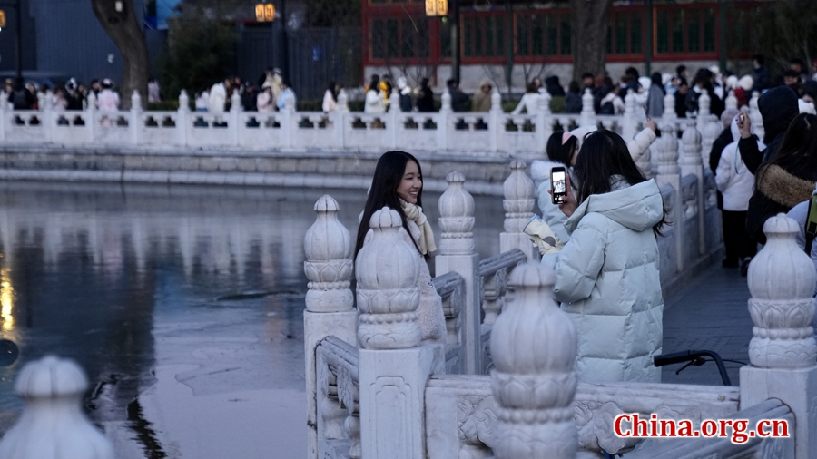Visitors take a photo at Shichahai, Beijing, Jan. 13, 2026. [Photo by Zhang Yuxin/China.org.cn]