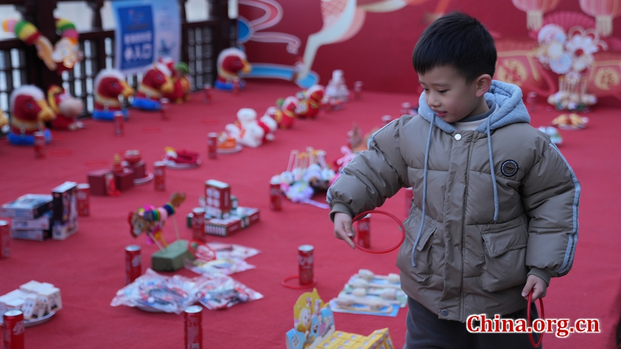 A boy plays ring toss at the carnival in Shichahai, Beijing, Jan. 13, 2026. [Photo by Zhang Yuxin/China.org.cn]