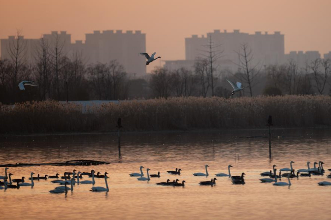 Migratory birds swim at Minghu Park in Chuzhou, east China's Anhui Province, Dec. 16, 2025. (Xinhua/Zhang Duan)