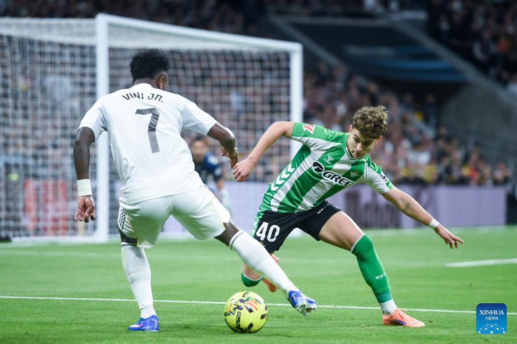 Real Madrid's Vinicius Junior (L) vies with Real Betis' Angel Ortiz during a La Liga football match between Real Madrid and Real Betis at Santiago Bernabeu stadium in Madrid, Spain, on Jan. 4, 2026. (Photo by Gustavo Valiente/Xinhua)