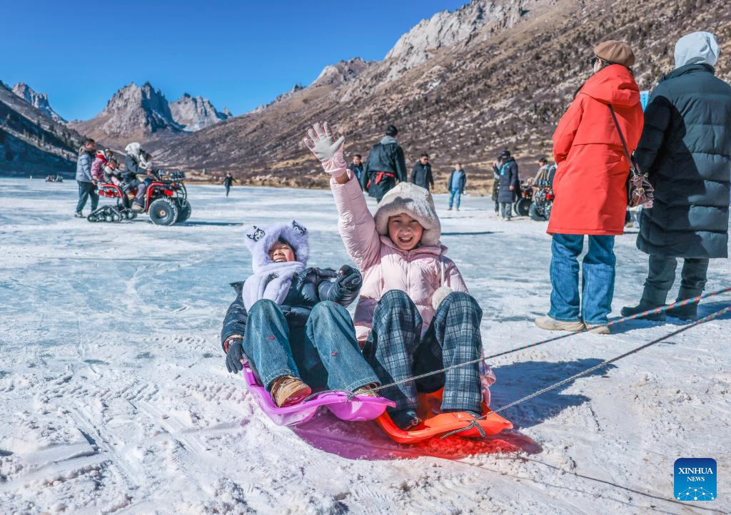 Children play on a frozen lake at a scenic area in Aba County of Aba Tibetan and Qiang Autonomous Prefecture, southwest China's Sichuan Province, Jan. 11, 2026. (Photo by Mi Lin/Xinhua)