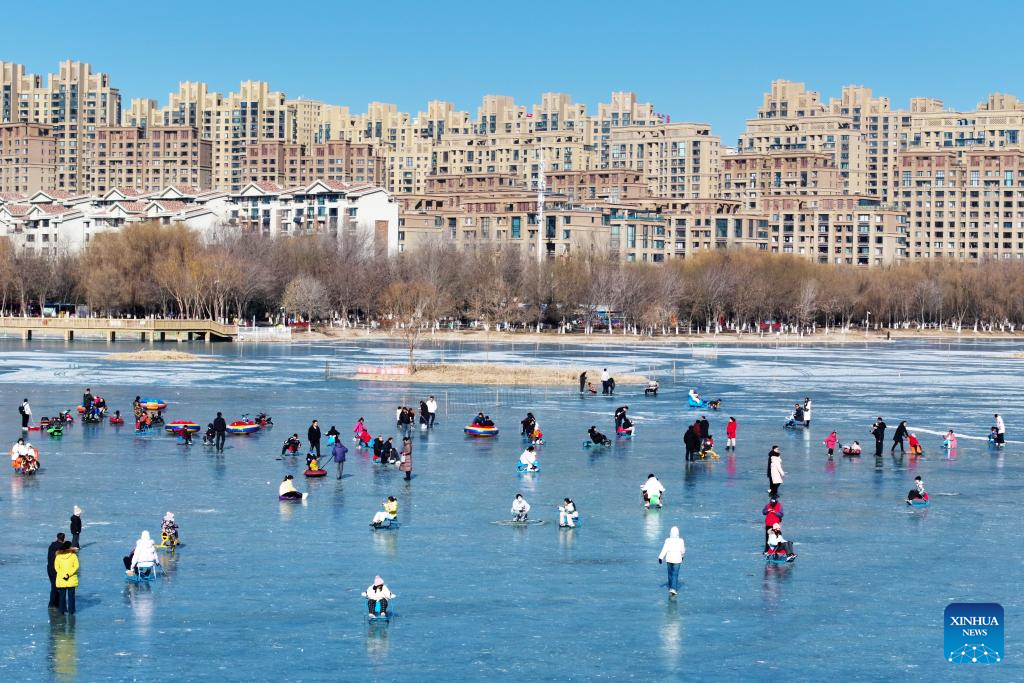 A drone photo shows people having fun on a frozen lake at Baohu Lake national wetland park in Yinchuan, northwest China's Ningxia Hui Autonomous Region, Jan. 11, 2026. (Photo by Yuan Hongyan/Xinhua)