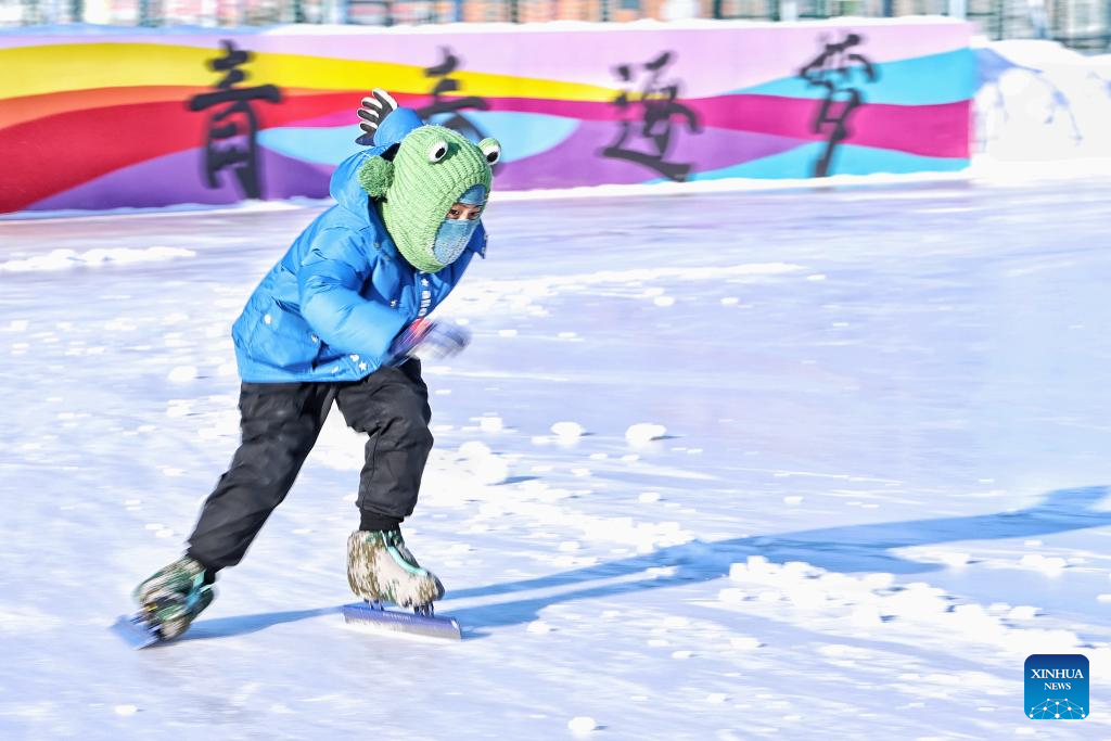 A student practices speed skating in Tongjiang City, northeast China's Heilongjiang Province, Jan. 12, 2026. (Photo by Liu Wanping/Xinhua)