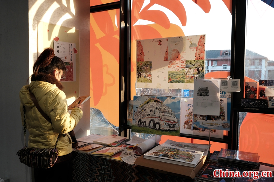 A woman reading picture books at the exhibition, Beijing, China, Jan. 13, 2026. [Photo by Liao Jiaxin/China.org.cn]