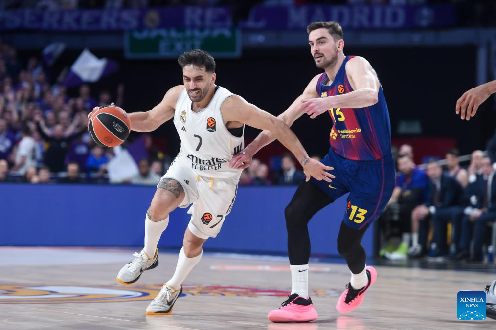 Real Madrid's Facundo Campazzo (L) vies with FC Barcelona's Tomas Satoransky during the Euroleague basketball match between Real Madrid and FC Barcelona in Madrid, Spain, on Jan. 16, 2026. (Photo by Gustavo Valiente/Xinhua)