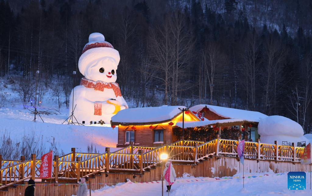 Tourists enjoy themselves at a scenic area in Mudanjiang, northeast China's Heilongjiang Province, Jan. 1, 2026. With the arrival of the ice and snow season, various public facilities in Heilongjiang Province have created distinctive snowman-themed landscapes to attract locals and tourists. [Photo/Xinhua]