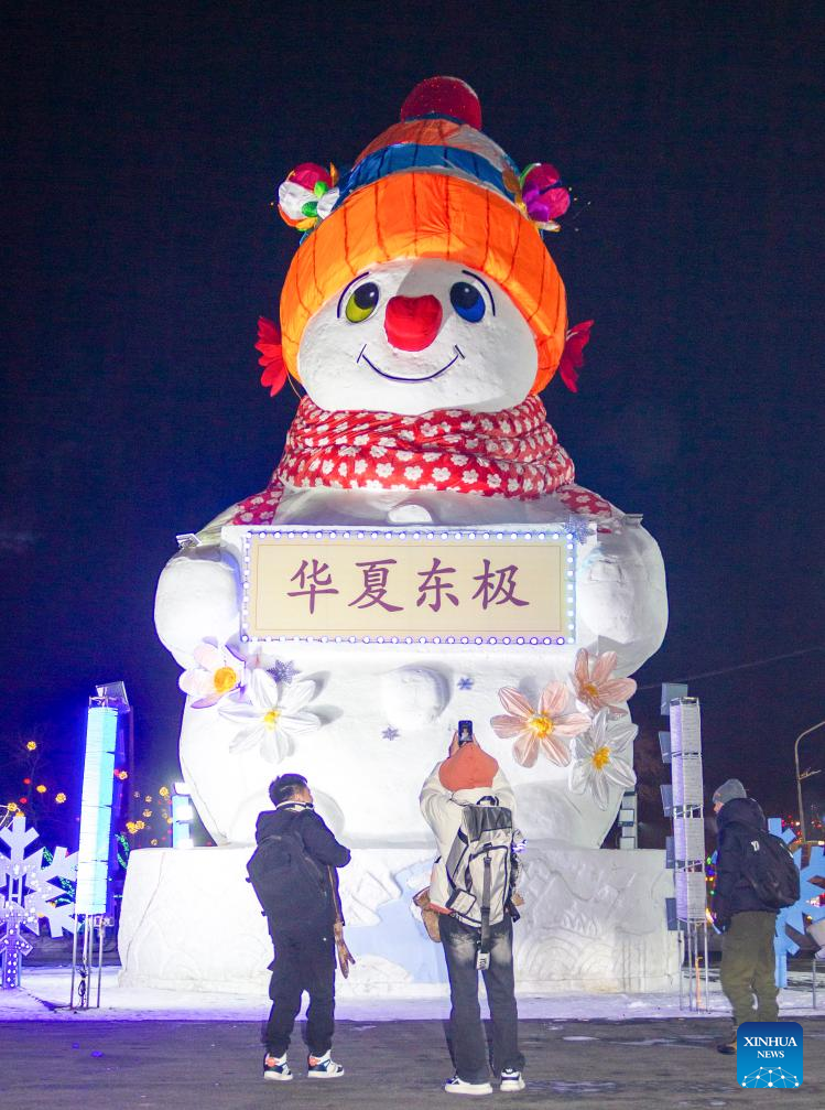 A tourist takes a photo of a giant snowman in Jiamusi City, northeast China's Heilongjiang Province, Jan. 15, 2026. With the arrival of the ice and snow season, various public facilities in Heilongjiang Province have created distinctive snowman-themed landscapes to attract locals and tourists. [Photo/Xinhua]