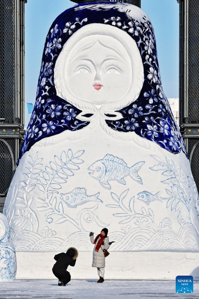 A tourist poses for photos in front of a giant snowman in Tongjiang City, northeast China's Heilongjiang Province, Jan. 16, 2026. With the arrival of the ice and snow season, various public facilities in Heilongjiang Province have created distinctive snowman-themed landscapes to attract locals and tourists. [Photo/Xinhua]