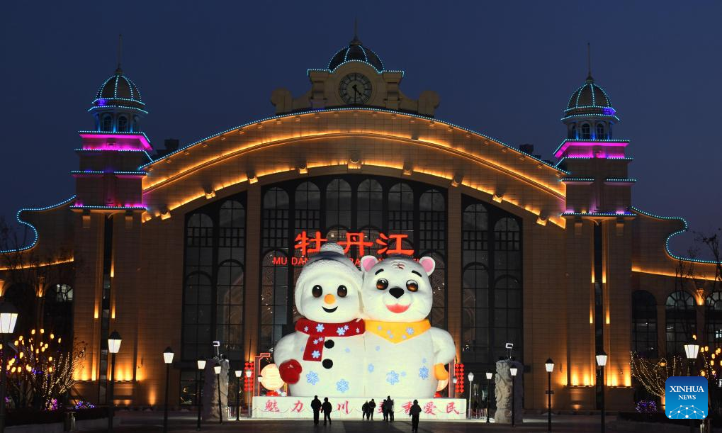 This photo taken on Jan. 15, 2026 shows giant snowmen at the north square of the Mudanjiang Railway Station in Mudanjiang, northeast China's Heilongjiang Province. With the arrival of the ice and snow season, various public facilities in Heilongjiang Province have created distinctive snowman-themed landscapes to attract locals and tourists. [Photo/Xinhua]