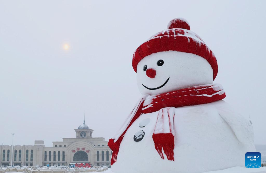 This photo taken on Jan. 10, 2026 shows a giant snowman in front of the Suifenhe Railway Station in Suifenhe City, northeast China's Heilongjiang Province. With the arrival of the ice and snow season, various public facilities in Heilongjiang Province have created distinctive snowman-themed landscapes to attract locals and tourists. [Photo/Xinhua]