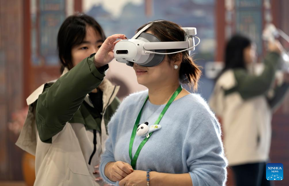 A visitor tries out a virtual reality headset at the Panda World in Fuzhou, southeast China's Fujian Province on Jan. 17, 2026. Five giant pandas, arriving from Chengdu, met the public at the reopened Fuzhou Panda World on Saturday, following a 20-day adaptation period. (Xinhua/Wei Peiquan)