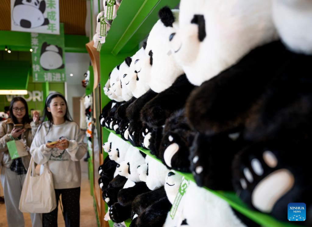 Tourists purchase panda-themed merchandise at the Panda World in Fuzhou, southeast China's Fujian Province on Jan. 17, 2026. Five giant pandas, arriving from Chengdu, met the public at the reopened Fuzhou Panda World on Saturday, following a 20-day adaptation period. (Xinhua/Wei Peiquan)