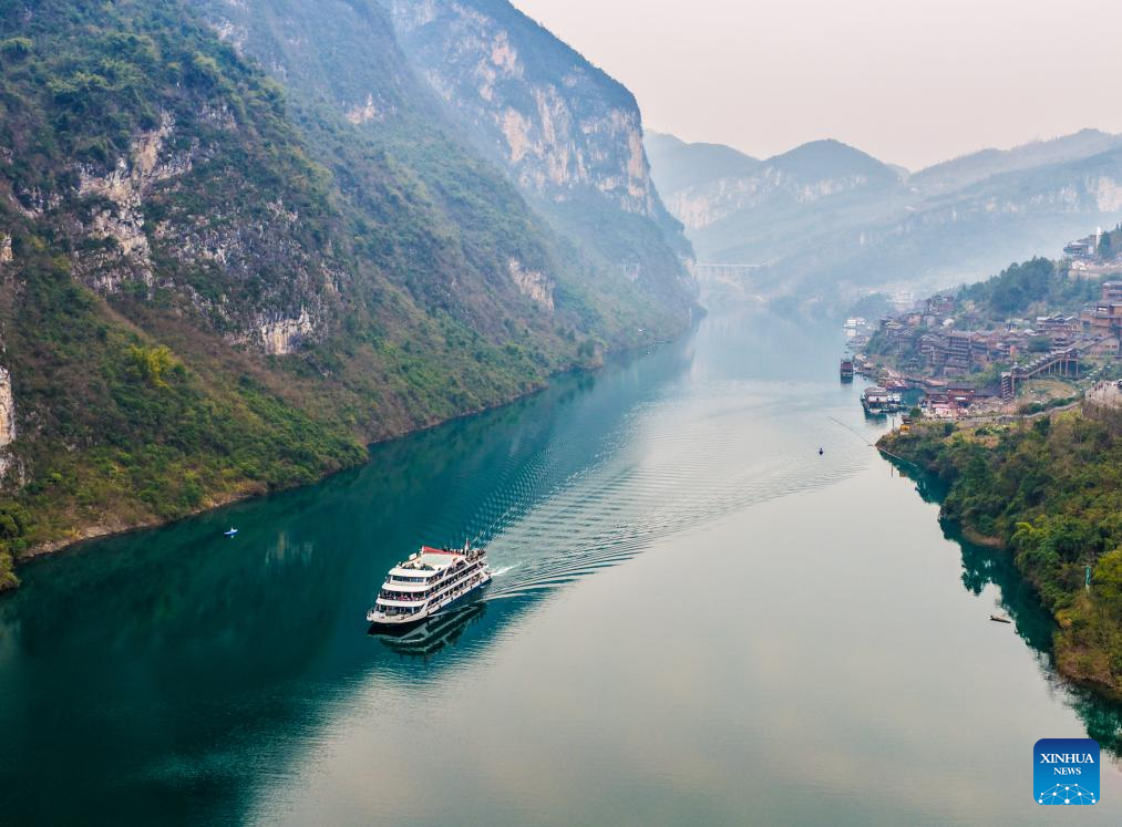 An aerial drone photo taken on Jan. 16, 2026 shows the scenery of the Wujiang River and Gongtan tourist resort in Youyang Tujia and Miao Autonomous County, southwest China's Chongqing Municipality. Located in the renowned Wujiang River Scenic Area and the Gongtan Ancient Town, the Wujiang River and Gongtan tourist resort has leveraged its abundant cultural heritage and unique natural landscapes to enhance its appeal in recent years.