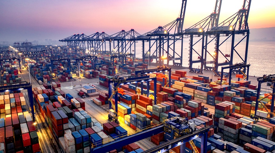 The bustling Yangpu International Container Terminal in Hainan province after the launch of island-wide special customs operations. [Photo by Chen Yuancai/Hainan Daily]