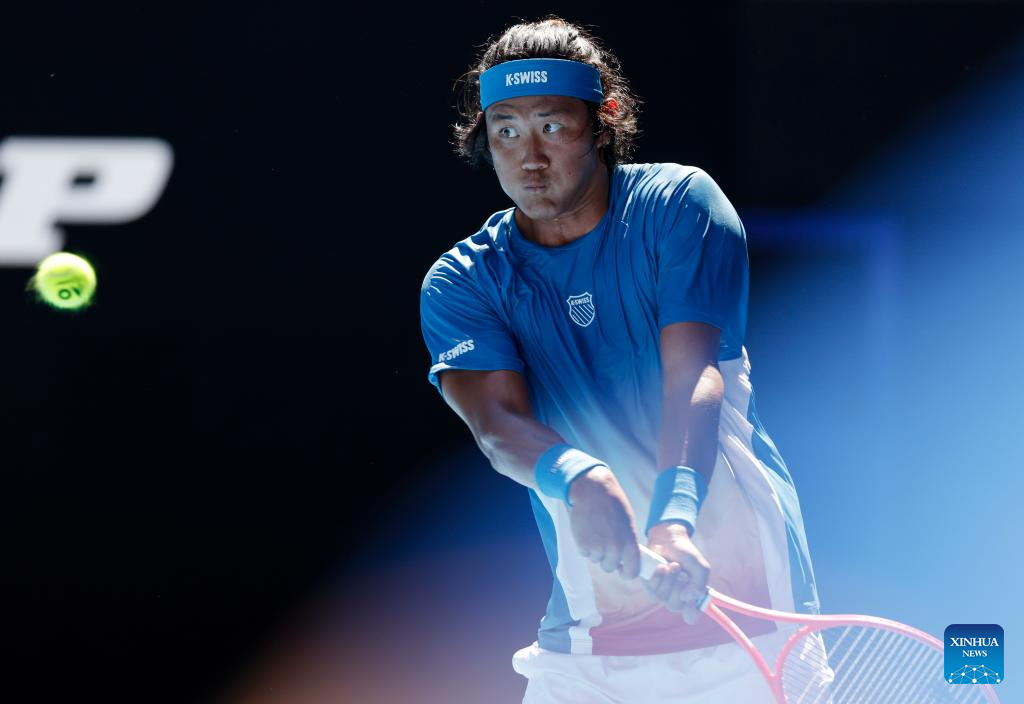 Zhang Zhizhen of China hits a return during the men's singles first round match between Zhang Zhizhen of China and Francisco Cerundolo of Argentina at the Australian Open tennis tournament 2026 in Melbourne, Australia, Jan. 18, 2026. (Xinhua/Ma Ping)