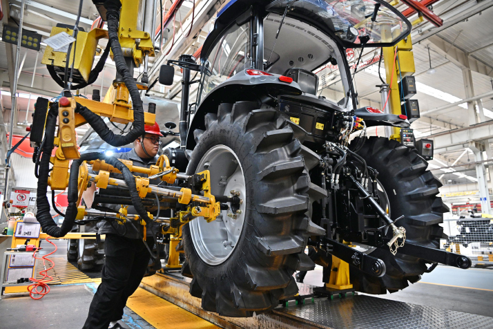 A technician assembles intelligent tractors at the workshop of an agricultural technology company in Weifang City, Shandong Province, on August 21, 2024. [Photo/Xinhua]