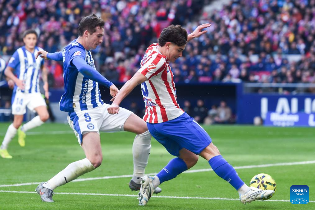 Atletico de Madrid's Julian Alvarez (R) vies with Deportivo Alaves's Jon Pacheco during La Liga football match between Atletico de Madrid and Deportivo Alaves in Madrid, Spain, on Jan. 18, 2026. (Photo by Gustavo Valiente/Xinhua)