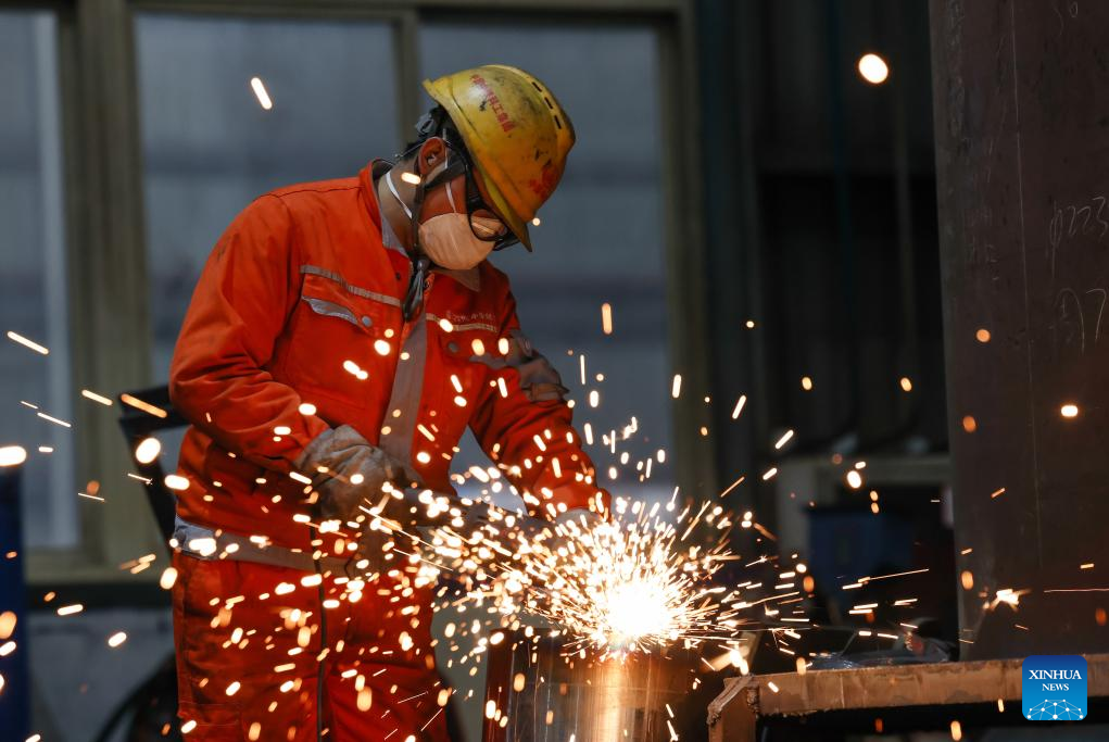 A technician welds components at a manufacturing base of China Railway Science & Industry Group Co., Ltd. in Wuhan, central China's Hubei Province, Jan. 19, 2026. (Photo by Zhao Jun/Xinhua)