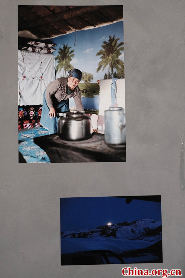 Two photographs are displayed at the "Morning in the Wind" exhibition in Jianchang Hutong, Beijing, Jan. 16, 2026. One showcases daily life, and the other a beautiful night scene of a snow-capped mountain in China's Xinjiang Uygur Autonomous Region. [Photo by Liao Jiaxin/China.org.cn]
