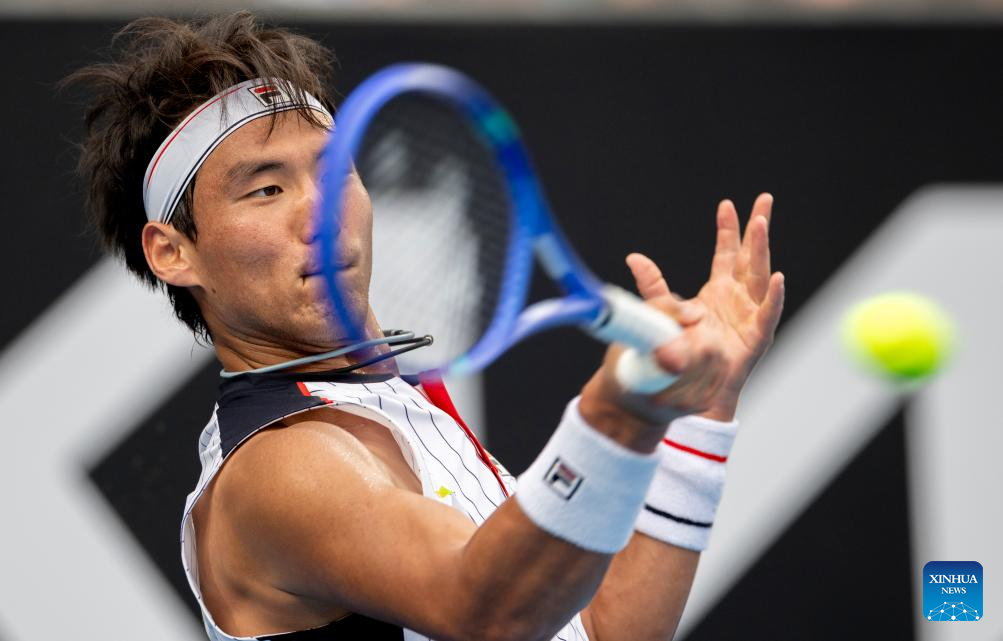 Bu Yunchaokete hits a return during the men's singles 1st round match between Bu Yunchaokete of China and Denis Shapovalov of Canada at the Australian Open tennis tournament in Melbourne, Australia, Jan. 19, 2026. (Photo by Hu Jingchen/Xinhua)