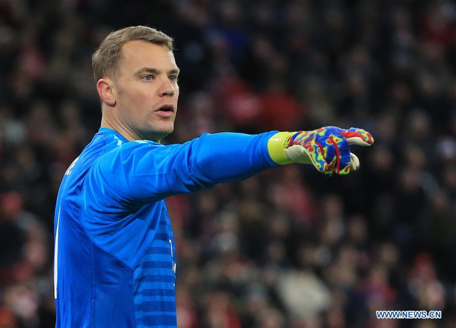 Bayern Munich's goalkeeper Manuel Neuer reacts during the UEFA Champions League 1/8 finals second leg match between Bayern Munich of Germany and Liverpool of England in Munich, Germany, on March 13, 2019. (Xinhua/Philippe Ruiz)