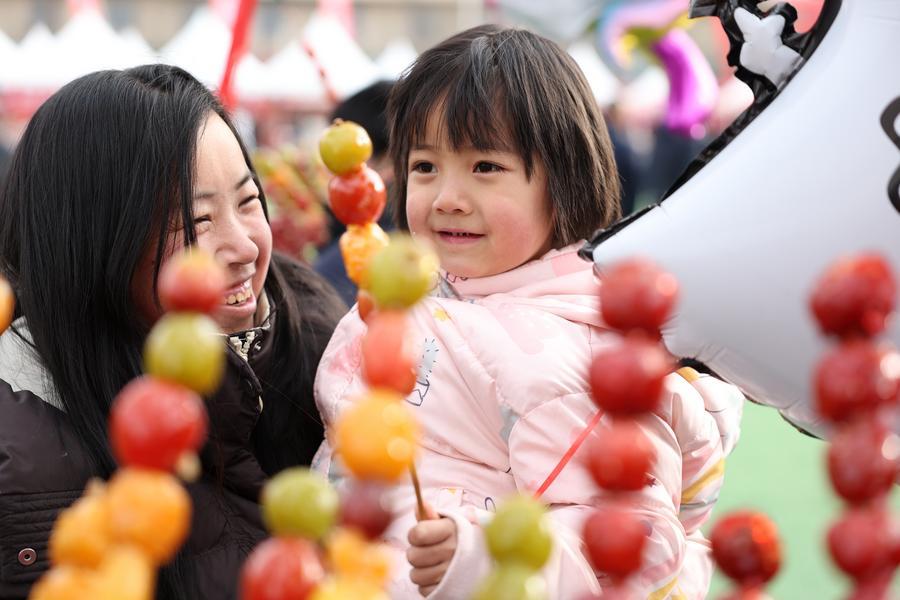 A child chooses a Tanghulu, a traditional Chinese snack consisting of sugar-coated haws or fruits, at a Spring Festival shopping market in Anding District of Dingxi City, northwest China's Gansu Province, Jan. 19, 2026. [Photo/Xinhua]